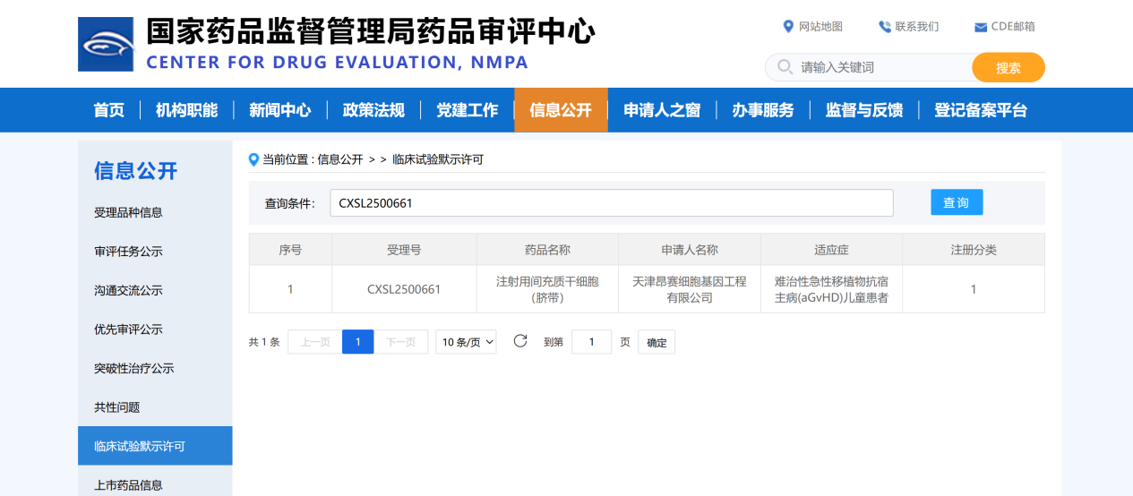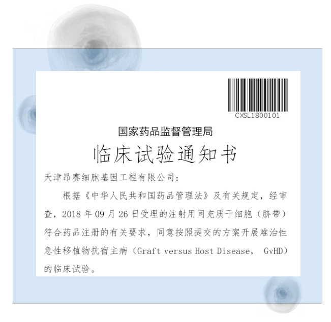 2025年11月3日, 天津昂賽細胞基因工程有限公司申報的注射用間充質干細胞(臍帶)治療難治性急性移植物抗宿主病(aGvHD)兒童患者的適應癥獲得國家藥品監督管理局臨床試驗默示許可