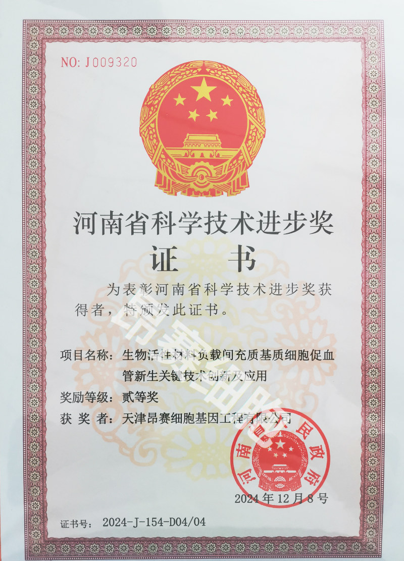 公司合作項目《生物活性材料負載間充質細胞粗促血管新生關鍵技術創新及應用》獲得河南省科學技術進步二等獎。