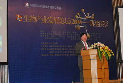 ??? 2009年11月17日,韓忠朝教授作為特邀嘉賓參加中國工程院在深圳第十一屆高交會上舉辦的主題為“再生醫(yī)學”的“生物產業(yè)發(fā)展論壇(2009)”。本次論壇由中國工程院醫(yī)藥衛(wèi)生學部主任楊勝利院士主持,中國工程院醫(yī)藥衛(wèi)生學部王正國院士擔任論壇執(zhí)行主席。中國工程院副院長鄔賀銓院士、深圳市副市長唐杰、國家發(fā)展和改革委員會高技術產業(yè)司巡視員綦成元出席并致辭。