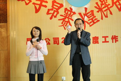 ???????????????????????年會上兩位風(fēng)趣、調(diào)動起年會氣氛的主持人:肖永娣、王斌