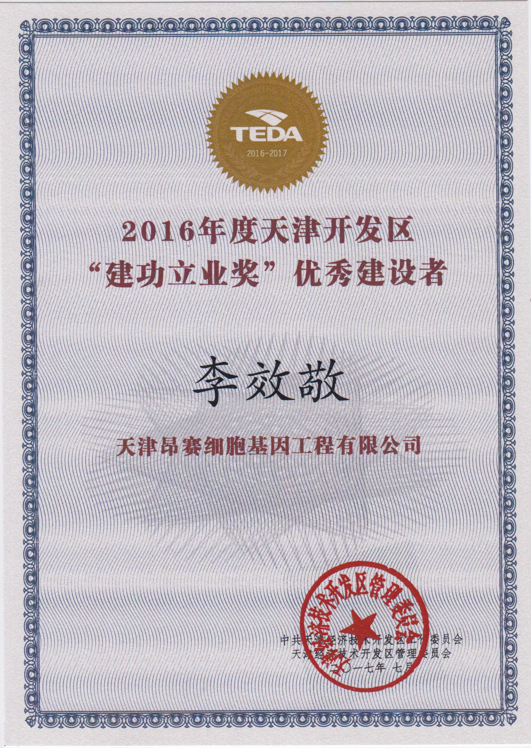 ? ? 2017年9月20日,我公司李效敬同志榮獲天津經(jīng)濟技術開發(fā)區(qū)頒發(fā)的2016年度“建功立業(yè)獎”。